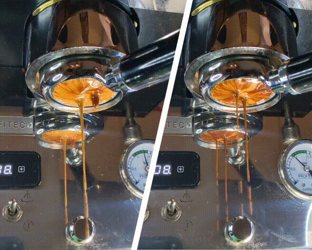The same water, the same coffee, and exactly 18g for both shots. While the right one flows beautifully, the left one shows channeling and its lighter colour indicates that the coffee is underextracted.