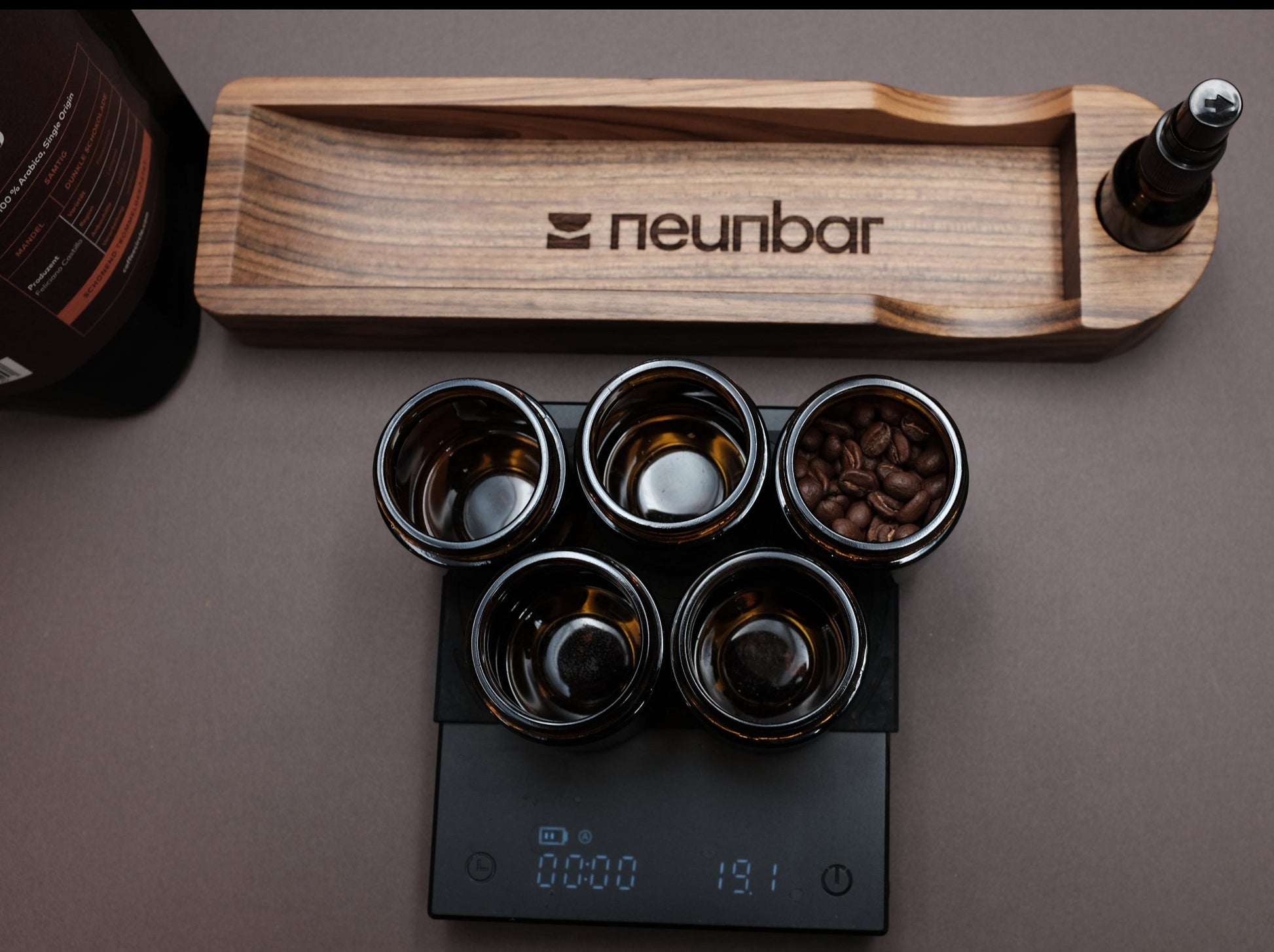 Our Rolling Pawns single-dosing glasses feature elegance and function. Store up to 25g of your favorite coffee in each of the five glasses, and enjoy the beautiful Ovangkol wood produced in Germany. Plus, the included WDT spray bottle helps prevent static while grinding. A great combo for coffee lovers!